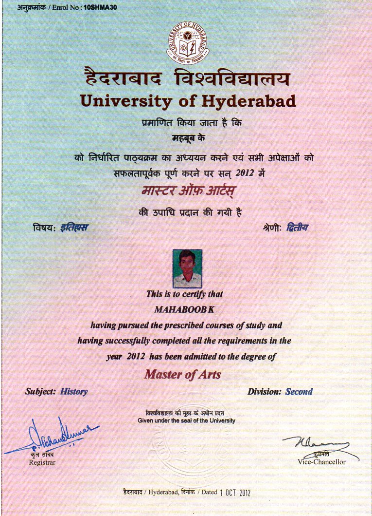 01/12/2015Post graduation M.A (hyderabad central university) 2010-12 Regular course, hyderabad, India Pursued master degree in history https://www.uohyd.ac.in