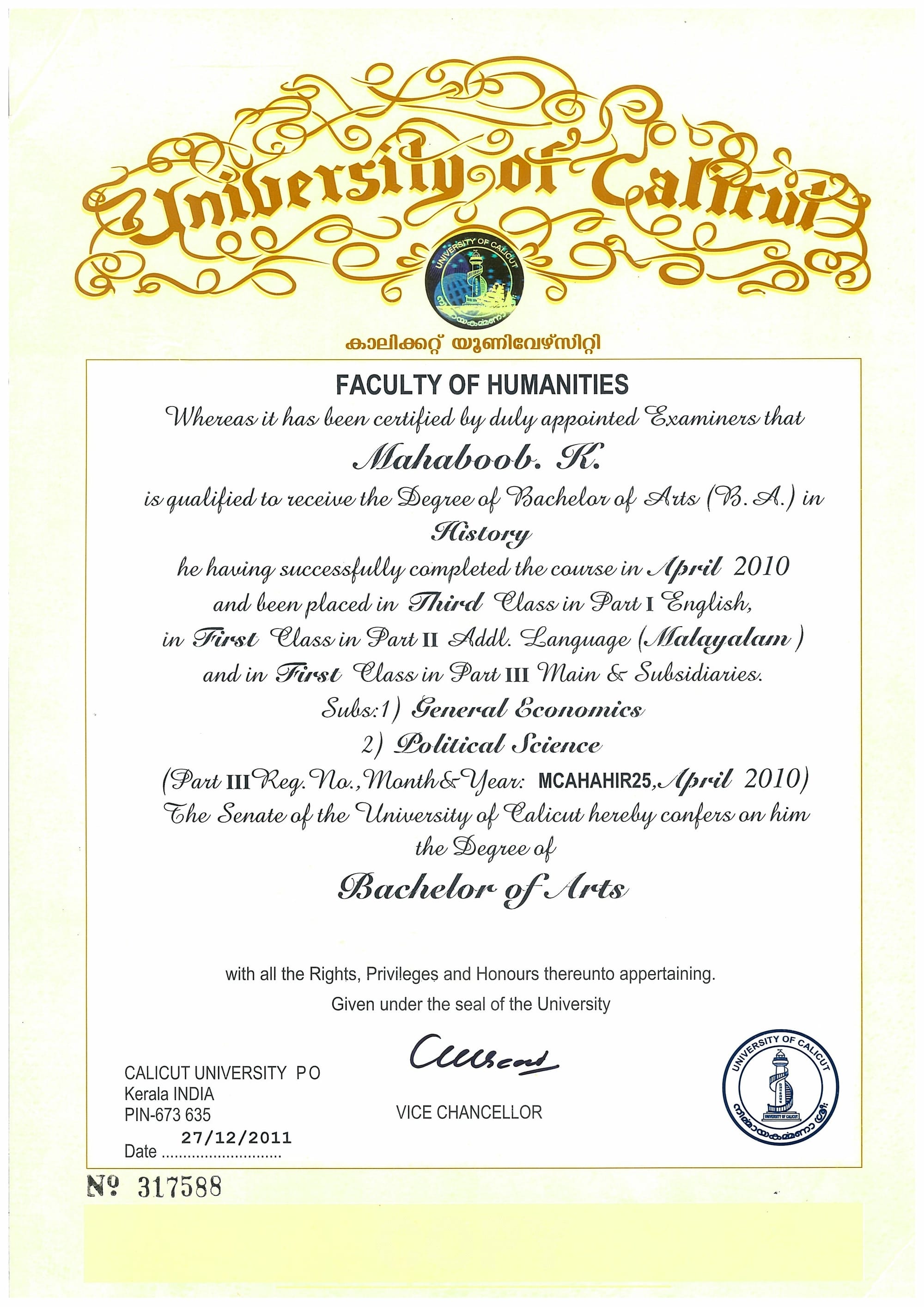 08/01/2012Bachelor B.A (calicut university) (2007-10) Regular course, calicut, India Pursued bachelor degree in history https://www.uoc.ac.in/